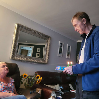 After a sit down in the Morrisons Cafe I made my way to the bus with my sister in law's birthday cake in a bag. Fortunately it was a sturdy cake and not damaged. After a lovely meal at a restaurant, my brother surprised her with the customary song.